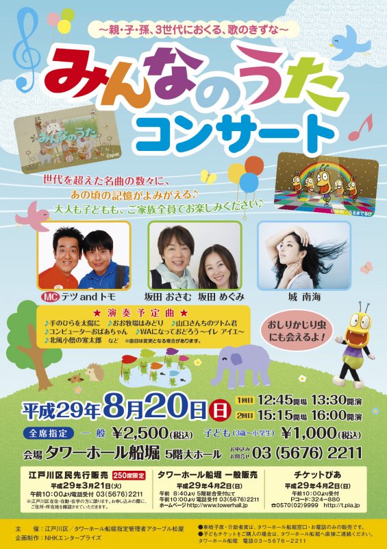 来月8月20日(日)は、みんなのうたコンサートがありますよ。(タワーホール船堀)テツトモさんや城南海さんとは久々の共演です。おしりかじり虫君も登場する、なんせ愉快な楽しいコンサートになることでしょう!是非遊びに来て下さいネ。以前テレビ収録でトモさんがステージで僕を紹介した時「坂田としおさ~~~ん!」って言ってしまって撮りなおしたことあるよ。(大笑)ごめんね、坂田師匠じゃないんだわん。(笑)
